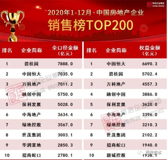 通過對比房企銷售額或銷售面積的排名,是最簡單且容易獲取的評價方法之一。目前市場上也有多家機構針對房企有各種排名,以銷售額排名為例,銷售額主要分為全口徑金額和權益金額,全口徑金額是指忽略房企對項目公司的持股比例,只要房企是項目股東,項目銷售額便全部納入全口徑金額內。權益金額是指只納入房企按照持股比例對應計算的項目銷售額。因此,對于合作開發項目較多的房企,全口徑簽約額會遠大于權益簽約額。下圖來源于克爾瑞2020年度房企銷售榜。
