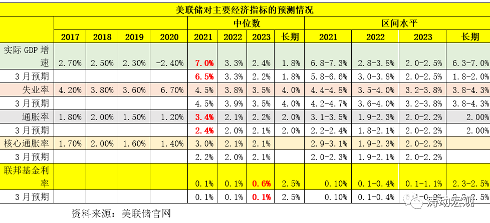 雖然仍繼續維持1.80%的經濟增速(中位數)、4%的失業率(中位數)、2%的通脹率(中位數),但卻大幅上調了2021年的經濟增速和通脹預期。