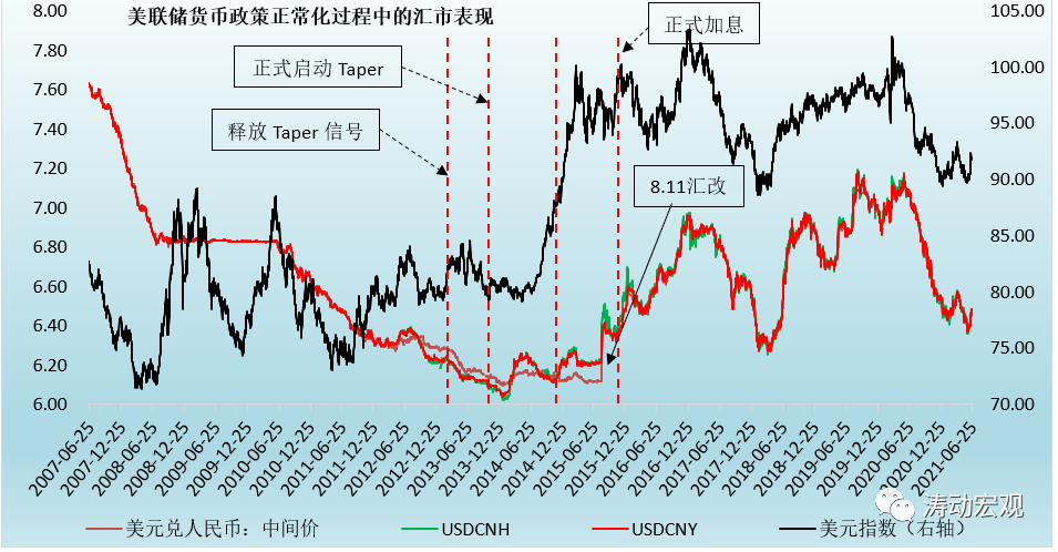 特別是我們看到,在美聯儲釋放加息預期信號后,美元指數的波動幅度明顯放大。這一時期,人民幣在正式啟動Taper之前仍呈現升值態勢,而在正式啟動Taper(特別是2015年的8.11匯改)后,貶值趨勢明顯且波動幅度明顯加大。