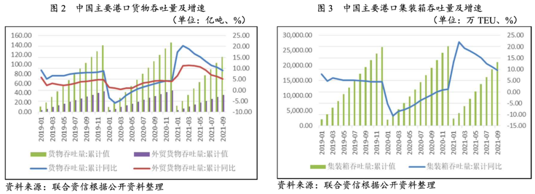 港口散雜貨的主要吞吐貨種包括煤炭、金屬礦石、石油、礦建材料、鋼鐵等。2021年1―10月,全國房地產開發投資累計完成12.49萬億元,同比增長7.20%,增速低于2019年水平;同期,全國基礎設施建設累計投資額同比增長0.72%,處于低水平。受制于房地產和基礎設施投資的持續放緩,以及“能耗雙控”政策的制約,2021年1―10月,全國水泥產量19.73億噸,同比增長2.10%,低于2019年6.10%的增速;同期,全國鋼材產量11.22億噸,同比增長2.80%,低于2019年9.80%的增速。12月召開的中央經濟工作會議提出要保證財政支出強度,加快支出進度,適度超前開展基礎設施投資;推進保障性住房建設,支持商品房市場更好滿足購房者的合理住房需求,因城施策促進房地產業良性循環和健康發展,但同時強調了要堅持房子是用來住的、不是用來炒的定位。預計2021年基礎設施建設投資將有所加速,房地產投資將保持平穩,港口礦建材料和鋼鐵的吞吐量將獲得一定支撐。