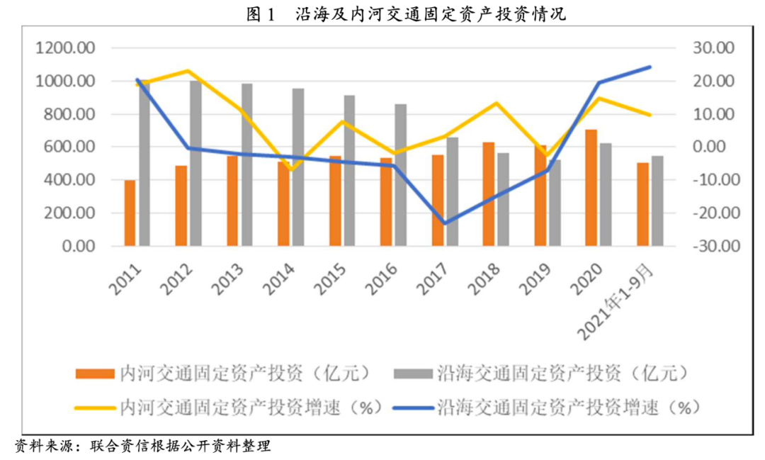 中國沿海港口處于結構性產能過剩階段,沿海港口整體投資規模呈下降趨勢;受益于內河航運的發展,內河港口投資規模呈上升趨勢。為應對疫情對宏觀經濟的沖擊,2020年以來,水路固定資產投資增速大幅回升。