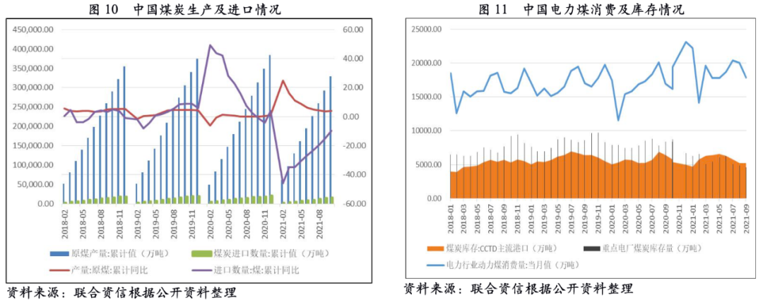 煤炭行業的下游需求主要集中在電力(約占54%)、鋼鐵(約占18%)和建材行業(約占10%)。2021年我國制造業及出口景氣度較高,對電力的消耗處于高位,2021年1—9月,全國火力發電量4.33萬億千瓦時,同比增長12.94%,帶動電力行業動力煤消耗量維持在相對較高水平。2021年1—10月,全國原煤產量32.97億噸,同比增長4.00%;同期,全國煤炭進口量1.61億噸,同比下降9.82%,主要受中澳關系緊張減少進口所致。受煤炭需求旺盛影響,CCTD主流港口煤炭庫存及重點電廠煤炭庫存目前均處于低位,存在較大補庫需求。此外,2019年9月28日,連接內蒙古浩勒報吉與江西吉安的浩吉鐵路全線通車運營,浩吉鐵路年規劃煤炭運力為2億噸,是中國“北煤南運”戰略運輸通道,其開通對煤炭海運及港口煤炭吞吐量造成較大分流。