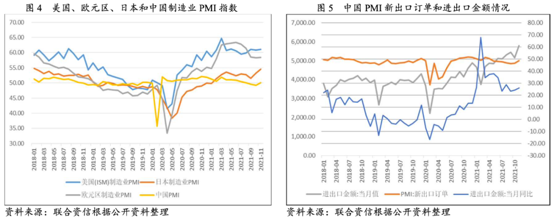 從全球經濟發展角度看,2020年爆發的新冠肺炎疫情對全球經濟造成劇烈沖擊,中國、美國、日本和歐元區制造業PMI指數分別于2020年2~5月創下了35.70%、41.50%、33.40%和38.40%的低點。隨著疫情防控的常態化,企業得以逐步復工復產,美國和歐洲經濟體普遍采取較大力度的財政、貨幣刺激方案,美國和歐元區制造業PMI從低點持續上升,并分別于2021年3月和6月創下64.70%和63.40%的高點,之后開始逐步回落。日本疫情控制相對較好,經濟刺激手段也相對克制,制造業PMI指數走勢與美歐基本趨同但波動幅度明顯較小,10月份以來受西方節前備貨需求影響明顯回升。中國疫情于2020年3月基本得到控制,之后制造業PMI指數一直在50.60%~52.10%之間小幅波動,直到2021年3月之后開始回落,9月份開始跌破50%的榮枯臨界點,11月受西方節前備貨需求影響略有回升,國內經濟下行壓力加大。疫情對全球經濟的影響已明顯弱化,且受制于全球通脹壓力不斷積累,各國開始逐步退出寬松政策,預計未來全球經濟增速將有所放緩。國際貨幣基金組織最新預測2021年全球經濟將增長5.8%,2022年將增長4.9%,2022年增速較2021年有所下降,但仍高于疫情前的平均水平(2012—2019年平均增速為3.42%)。