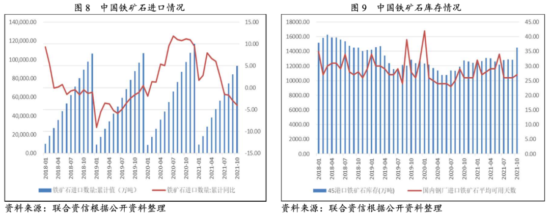 受制于鋼鐵產量的低增長,2021年1—10月中國鐵礦石進口量同比負增長,鋼廠開工率不足以及港口鐵礦石庫存偏高導致短期內鐵礦石進口及港口吞吐量面臨一定壓力,若未來鋼材需求及產量增速回升,港口鐵礦石吞吐壓力將有所緩解。
