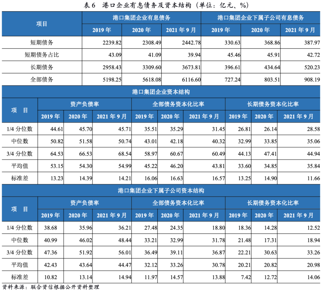 值得關注的是,港口集團企業負債水平分化較為明顯,處于后1/4分位的港口集團企業負債水平明顯偏高,其中6家企業2021年9月底的全部債務資本化比率超過60%。