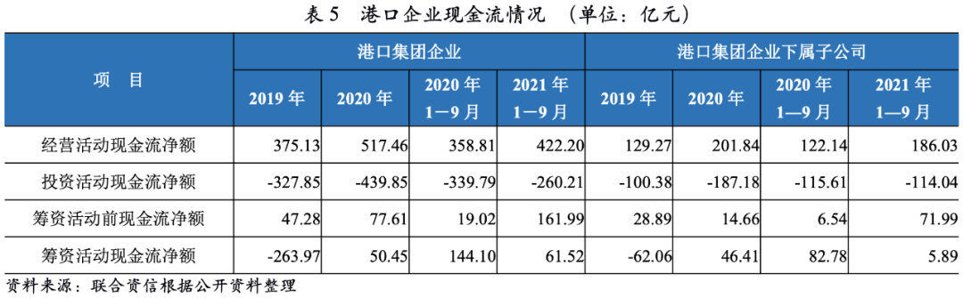 2021年前三季度,港口集團企業經營活動現金流量凈額同比增長17.67%;投資活動現金凈流出同比下降34.31%;籌資活動前現金流凈額為161.99億元,籌資活動現金凈流入61.52億元,融資需求及籌資力度較2020年均有所減弱。2021年前三季度,港口企業下屬(股份)子公司經營活動現金凈流入同比增長52.31%;投資活動現金凈流出與去年同期基本持平;籌資活動前現金流凈額為71.99億元,籌資活動現金凈流入5.89億元,融資需求及籌資力度較2020年均明顯減弱。