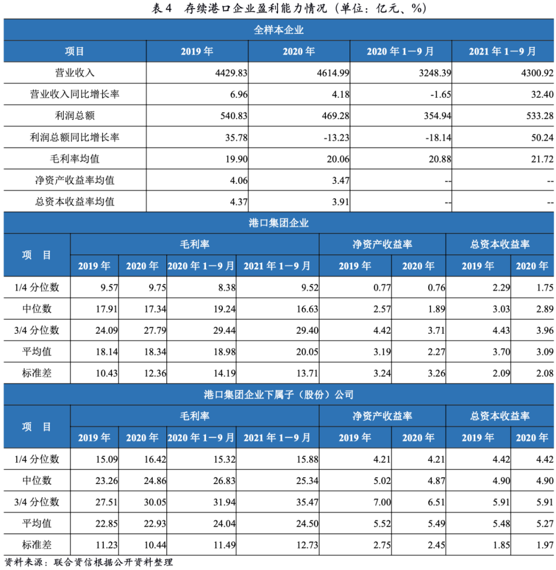 值得關注的是,港口企業盈利能力分化較為明顯,處于后1/4分位的港口集團企業盈利能力指標明顯較弱,其中5家企業2020年及2021年前三季度歸屬母公司凈利潤持續為負。