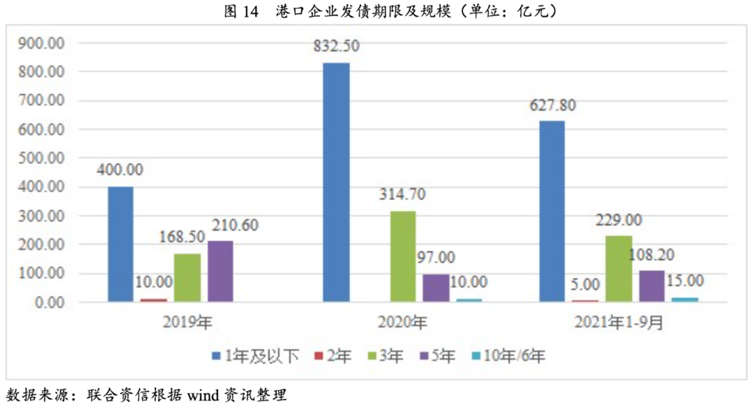 從發行期限看,2020年港口企業新發債券期限以1年期及以下、3年期和5年期為主,發行規模占比分別66.38%、25.09%和7.73%。2021年前三季度,港口企業1年及以下債券發行規模占比最高,為63.74%,較上年下降2.91個百分點;3年期發行規模占比為23.25%,較上年變化不大;5年期債券發行規模占比為10.98%,較上年上升3.25個百分點。
