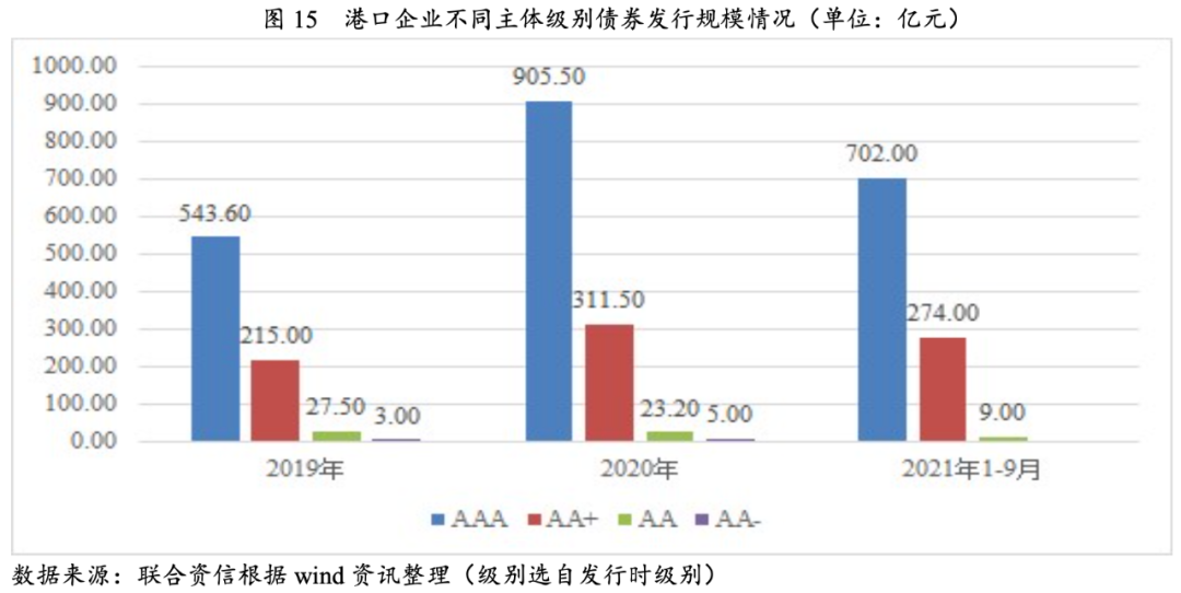 從發債主體級別來看,2020年,AAA、AA+、AA級別港口企業債券發行期數分別為96支、70支和5支,占比分別為55.81%、40.70%和2.91%;發行規模分別為905.50億元、311.50億元和23.20億元,占比分別為72.20%、24.84%和1.85%。2021年前三季度,AAA級別企業發債期數最多,共計發行75支債券(占55.56%),發行規模合計702.00億元(占71.27%),各級別企業發債支數和規模占比較2020年全年水平變化不大。