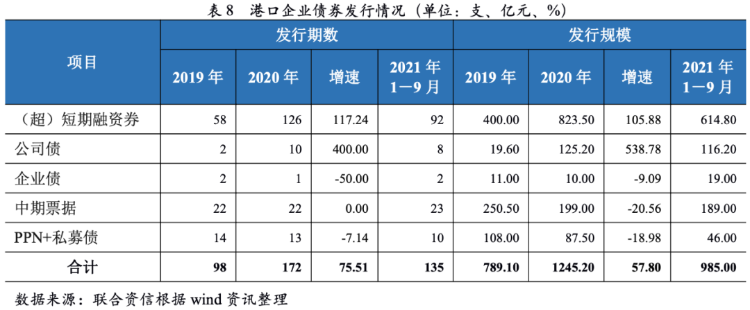 2020年,港口企業共計發行債券172支,發行期數同比增長75.51%;發行規模合計1245.20億元,同比增長57.80%。2021年前三季度,港口企業合計發行債券135支、發行規模1245.20億元,分別較上年同期下降3.57%和3.53%。整體看,2020年以來,港口企業債券發行期數和規模保持在較高水平。
