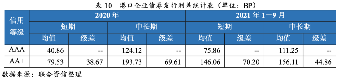 2021年以來,港口企業短期發行利差整體呈波動上升趨勢,長期發行利差相對穩定,AA+級短期級差走闊,AA+級中長期極差有所收縮。