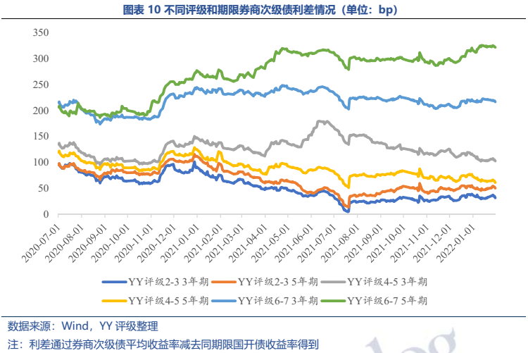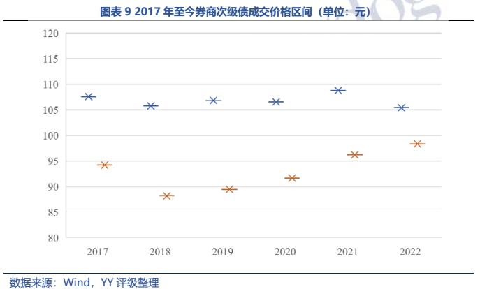 目前現(xiàn)存券商次級(jí)債多為可用于補(bǔ)充附屬凈資本的長期次級(jí)債,YY評(píng)級(jí)在2-3以及5-6+的頭部和腰部券商為發(fā)行主力,發(fā)行人資質(zhì)整體較優(yōu)。相對(duì)于銀行二級(jí)資本來說,券商次級(jí)債條款設(shè)置較為友好,目前存續(xù)債均未附減記條款且永續(xù)次級(jí)債尚無延期情況出現(xiàn)。收益率分級(jí)別來看,頭部和尾部近年分化加大,利差已擴(kuò)大至200bp。