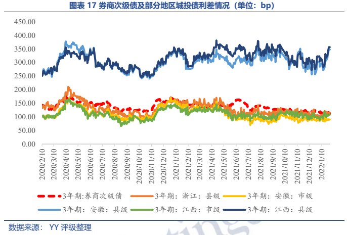 供需格局方面,券商作為重要金融資源之一,多為央企或地方政府實(shí)控,承擔(dān)著擴(kuò)容資本市場和提高直接融資比重的使命;歷史來看,監(jiān)管對(duì)以往違規(guī)操作和風(fēng)險(xiǎn)暴露券商的處置落地整體較為穩(wěn)妥且以警示為主,券商持續(xù)經(jīng)營假設(shè)較為成立。因此,作為唯一可用于補(bǔ)充凈資本的債券,券商次級(jí)債供給規(guī)模預(yù)計(jì)將維持較高水平;而主體的持續(xù)經(jīng)營假設(shè)也賦予了其債券產(chǎn)品較厚的安全邊際,高于中部市級(jí)城投和浙江縣級(jí)城投的收益率也帶來一定性價(jià)比優(yōu)勢,預(yù)計(jì)后續(xù)配置熱情也將持續(xù)。