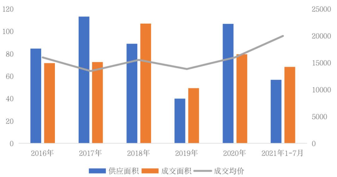 圖:2016年-2021年前7月衢州主城區商品住宅供求量價(單位:萬平方米、元/平方米)