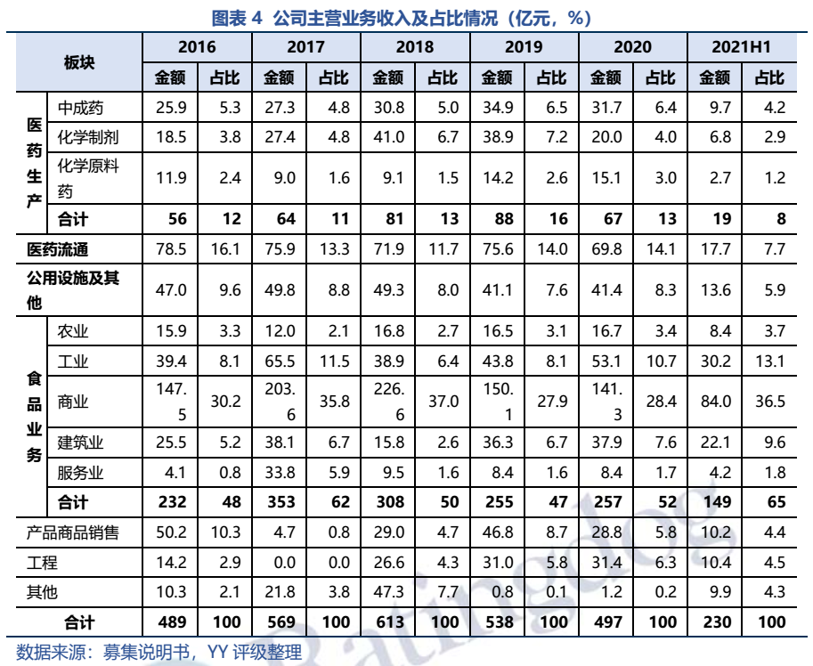 公司主營業(yè)務包括醫(yī)藥生產及醫(yī)藥流通板塊(已出表)、食品業(yè)務板塊、公共設施及其他等,核心子公司包括天津醫(yī)藥、天津食品、津聯集團等。近年來收入規(guī)模持續(xù)收縮,目前子公司中,天津醫(yī)藥和中環(huán)集團已完成混改,天津醫(yī)藥出表,對公司主營業(yè)務合并層面影響較大,未來可比性弱。
