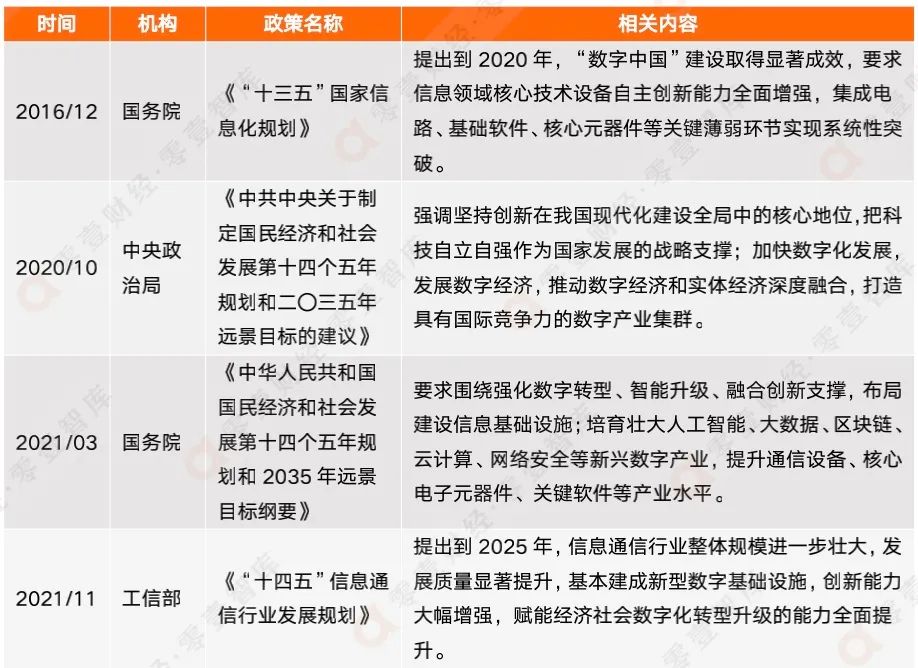 在2021年兩會期間,“數字化轉型”一詞多次被提到,并在《中華人民共和國國民經濟和社會發(fā)展第十四個五年規(guī)劃和2035年遠景目標綱要》中多次出現,可見其重要性。在2020年之前,數字化發(fā)展與信創(chuàng)早已有了聯系。2016年,國務院出臺《“十三五”國家信息化規(guī)劃》,要求到2020年,“數字中國”建設取得顯著成效,要求信息領域核心技術設備自主創(chuàng)新能力全面增強。2020年以后,中央更是直接提出“圍繞強化數字轉型”建設信息基礎設施,信創(chuàng)發(fā)展帶來“IT基礎設施”、“基礎軟件”、“應用軟件”、“信息安全”等方面的創(chuàng)新能力的提升,將賦能“經濟社會數字化轉型升級的能力全面提升”。