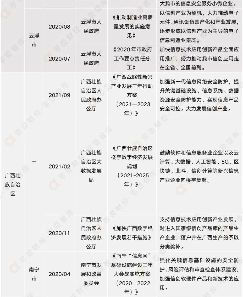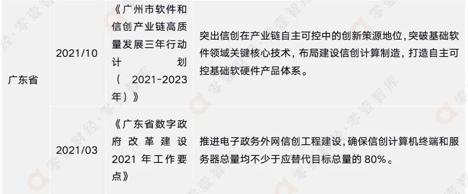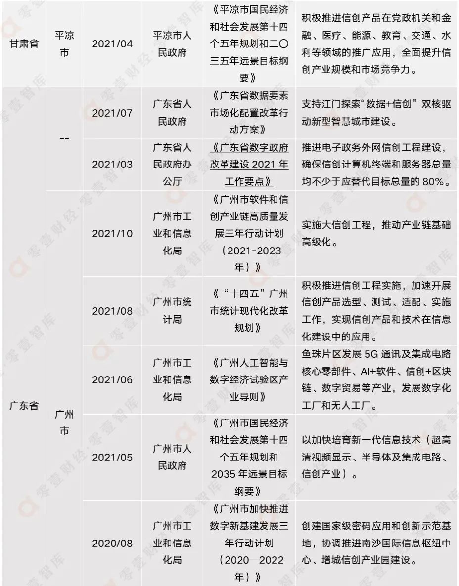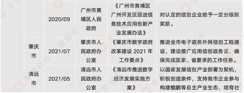 雖然信創(chuàng)產業(yè)如今大熱,但鮮有政府出臺信創(chuàng)專項政策,目前僅有廣州市工業(yè)和信息化局出臺的《廣州市軟件和信創(chuàng)產業(yè)鏈高質量發(fā)展三年行動計劃(2021-2023年)》。信創(chuàng)產業(yè)的發(fā)展并不久遠,相信隨著信創(chuàng)的進一步發(fā)展,其重要性會更加凸現,政府的關注度和重視程度也會大幅提高。