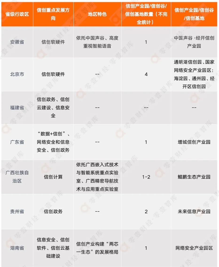 總結上述信創(chuàng)相關政策,可以看出各地方的信創(chuàng)發(fā)展重點各不相同,并帶有其獨特的地區(qū)特色。地方信創(chuàng)發(fā)展重點主要包含四方面:信創(chuàng)軟硬件、信創(chuàng)政務、信息安全、信創(chuàng)云建設,重點發(fā)展信創(chuàng)軟硬件的研發(fā)和應用的地區(qū)有安徽省、北京市、湖南省、天津市,重點關注信創(chuàng)政務的地區(qū)包含福建省、廣東省、貴州省、上海市、云南省,重點發(fā)展信息安全的地區(qū)有福建省、廣東省、湖南省、吉林省、四川省,重點發(fā)展信創(chuàng)云建設的地區(qū)則有福建省、湖南省、寧夏回族自治區(qū)。
