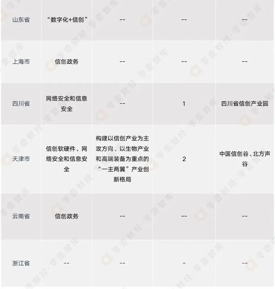 隨著信創(chuàng)發(fā)展到了一定階段,各地政府對當地信創(chuàng)產業(yè)發(fā)展要求以及路線不可避免地發(fā)生了改變。根據各地方政府近兩年來發(fā)布的最新的信創(chuàng)相關政策文件可以看出,以浙江省、北京市、四川省為代表的省級行政區(qū)因地制宜,明確提出在當地建設信創(chuàng)基地,依托當地企業(yè)、科研院所等優(yōu)勢,在當地建立信創(chuàng)生態(tài),避免在信創(chuàng)發(fā)展中后期可能存在的受制于人的情況。以天津市、山東省、安徽省為代表的省級行政區(qū)則加速發(fā)展信創(chuàng)硬軟件,推進信創(chuàng)、人工智能、5G+等多熱門領域協同發(fā)展發(fā)展,力求在信息技術領域全方面、立體化發(fā)展。