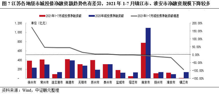 江蘇各地級市城投債凈融資額趨勢也有差異,2021年1-7月鎮江市、淮安市凈融資規模下降較多