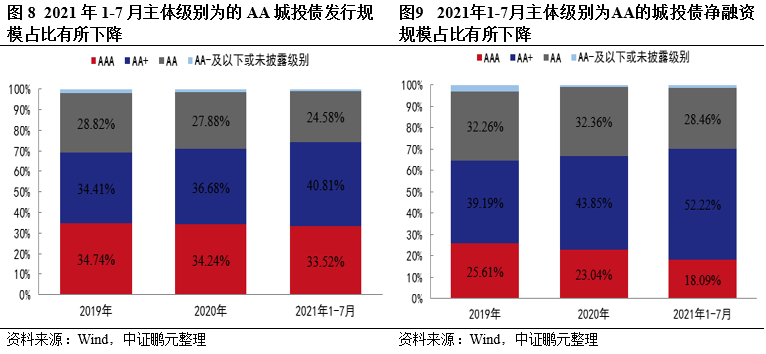 隨著對弱資質城投公司發行債券審核趨嚴,2021年1-7月AA級城投公司債券發行及凈融資規模占比較2020年均有所下降,而AA+級城投公司發行規模及凈融資額占比顯著提升,2021年1-7月AA+城投債凈融資額占比超過50%。