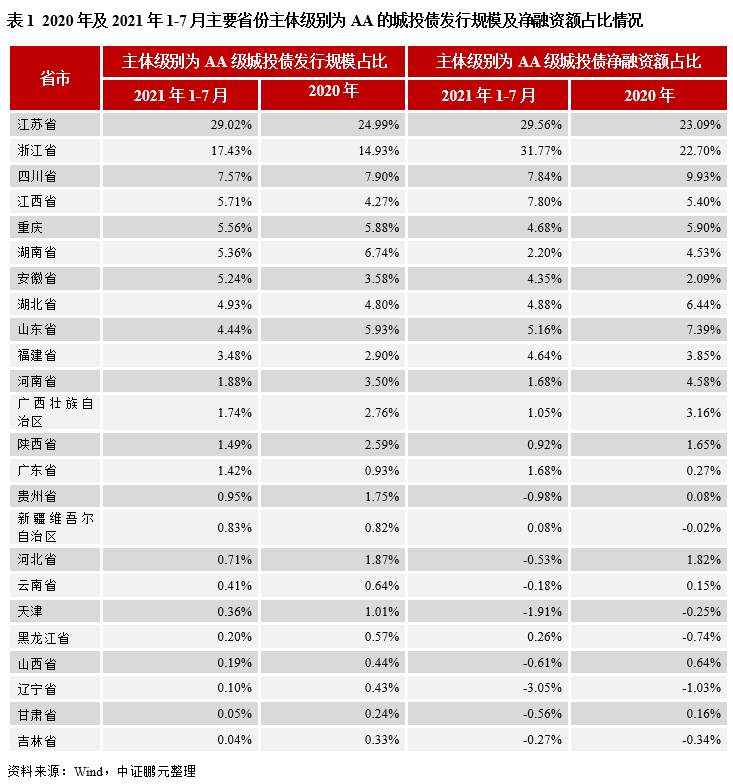 2021年1-7月AA級城投公司債券發行及凈融資規模占比較2020年均有所下降,監管政策對于各區域AA級城投公司融資影響程度有所差異,江蘇、浙江、江西、安徽的AA級城投公司影響相對有限,而湖南、山東、河南、廣西、陜西、貴州等地區AA級城投公司融資進一步壓縮。