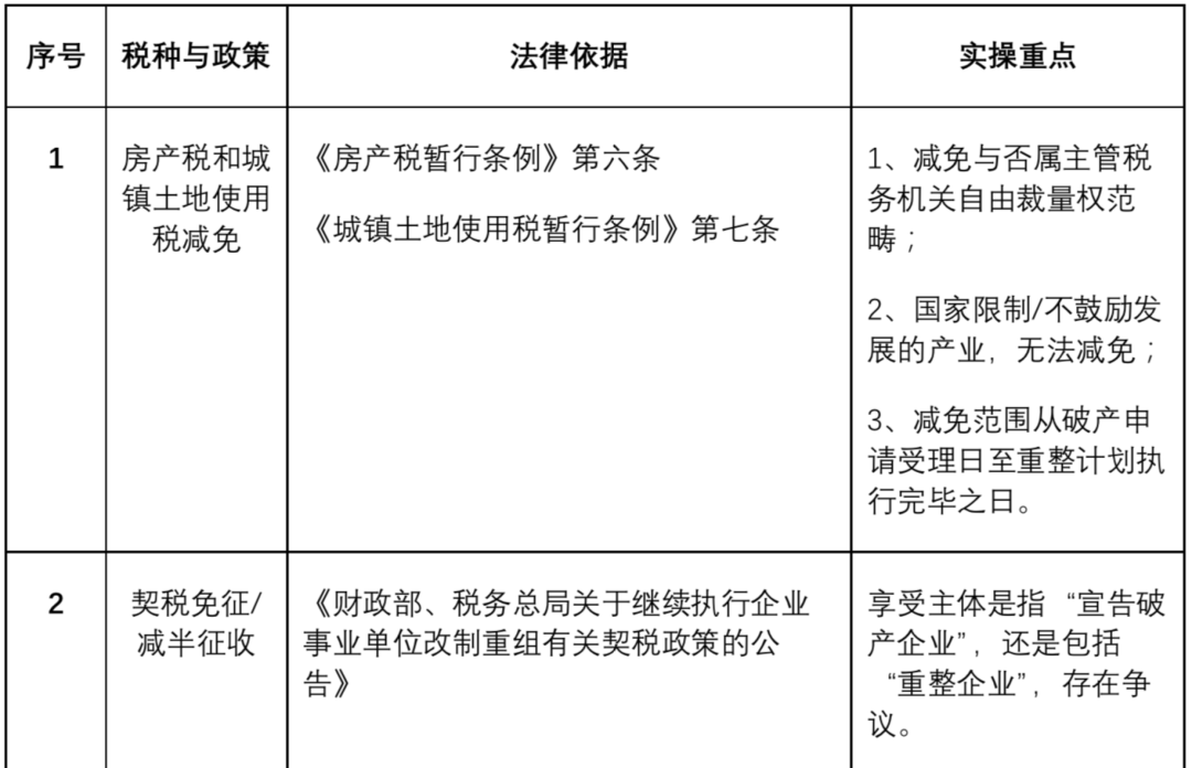 我國目前沒有專門針對破產企業適用的稅收優惠政策,這也增大了在破產程序中對稅負成本預測的難度。筆者對目前我國破產程序中涉及的稅收優惠政策整理如下(表二):