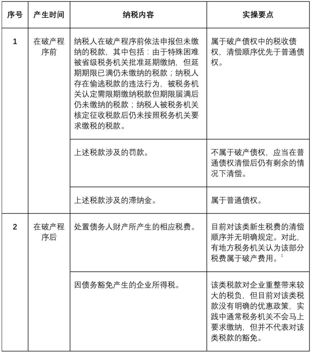 而對于作為債務人的破產企業而言,其涉稅內容在破產法項下有特別的規定與要點,由于債務人所需承擔稅負直接影響到破產財產的分配情況,或是重整計劃/和解協議的執行,對債權人而言十分重要,因此筆者作了如下梳理(表一):