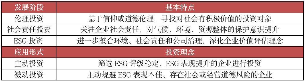 對于市場而言,ESG最早起源于倫理投資,隨著時代的發展以及概念的成熟,近年來在倫理投資、社會責任投資、綠色金融的基礎上進一步深化形成ESG投資的概念。即通過整合環境、社會責任和公司治理,形成了一種除財務指標、盈利能力外的更為完善的企業價值評估理念。