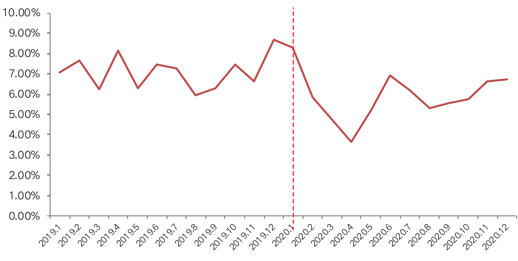 圖:2019-2020年房企單月融資成本情況