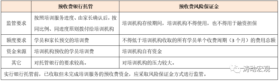 為避免出現(xiàn)“退費(fèi)難、卷錢跑路”等情況,2號(hào)文提出通過銀行托管和風(fēng)險(xiǎn)保證金兩種方式實(shí)行預(yù)收費(fèi)監(jiān)管。這兩種方式各地可以根據(jù)實(shí)際情況自主選擇。