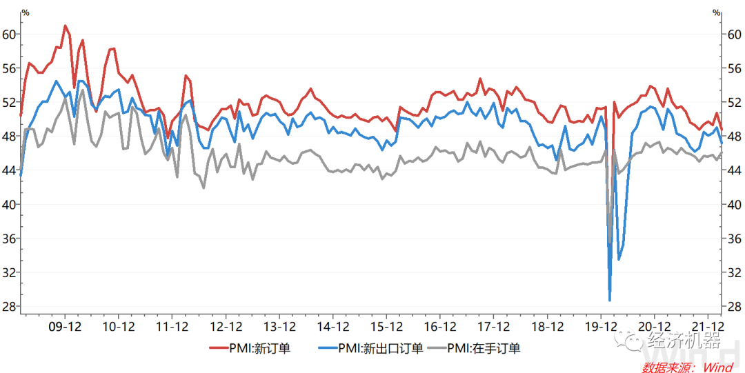 2)新訂單回落,但在手訂單環比改善。3月,PMI新訂單指數為48.8%,較上月回落1.9個百分點。其中,新出口訂單為47.2%,較上月回落1.8個百分點,內外需均受較大的拖累。3月份在手訂單指數較上月回升0.9個百分點,至46.1,環比出現改善,但絕對水平仍然偏低。訂單代表未來需求,影響企業預期,訂單數據整體偏弱,表明經濟增長動能未來面臨一定回落壓力。