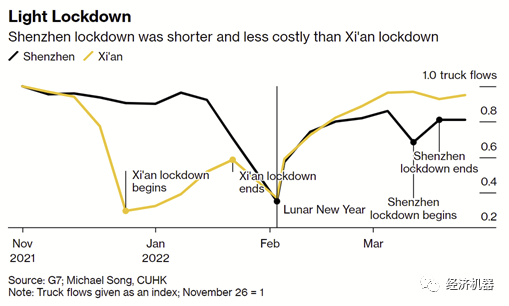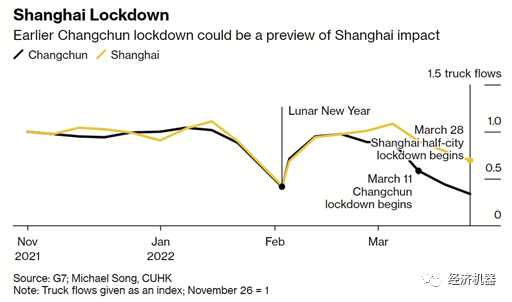 據香港中文大學宋錚團隊對疫情影響的量化分析顯示,在3月28日“定向封控”之前,上海此輪防疫限制導致經濟活動較正常情況下降40%。相比之下,吉林長春的封控已經導致經濟活動水平下滑66%以上。
