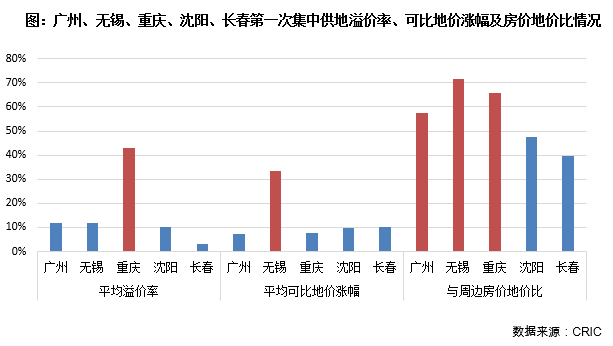 重慶、無錫熱度較高,重慶由于不限地價,整體溢價率超過40%,無錫作為長三角核心城市三四線,受到房企更多青睞,本次成交16宗地平均可比地價上漲30%以上;