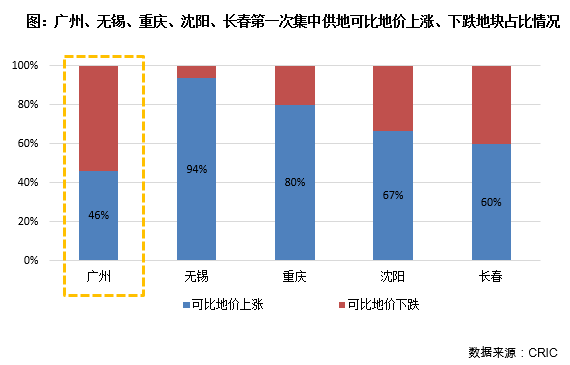 除了不同城市的熱度有所分化以外,同一城市內部也出現分化,這一特征在廣州表現得尤其明顯:廣州首次集中拍地中,可比地價上漲和下跌的地塊分別占46%和54%,分化顯著,與無錫、重慶八成地塊可比地價上漲差距頗大。