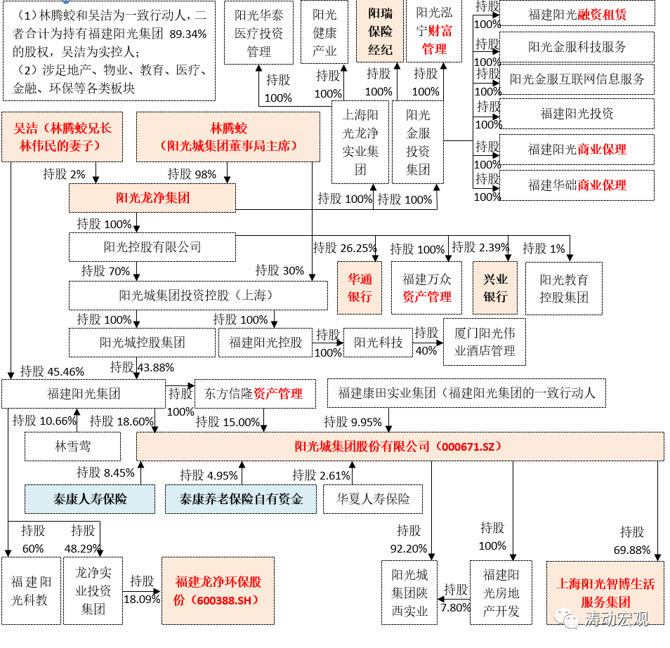 (2)進一步穿透來看,陽光龍凈集團通過陽光控股、陽光金服投資集團以及上海陽光龍凈實業集團對外進行產業布局,包括教育、醫療、金融等板塊。