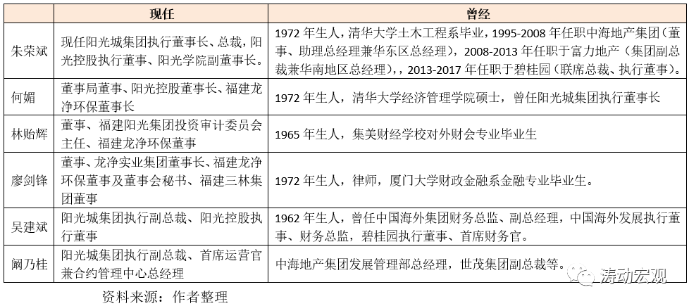 除吳潔和林騰蛟外,陽光城集團的主要人物還包括朱榮斌、何媚、林貽輝、吳建斌以及闞乃桂等人,這些要么是陽光城體系的元老級人物,要么是從其它地產企業體系引進來的人物。