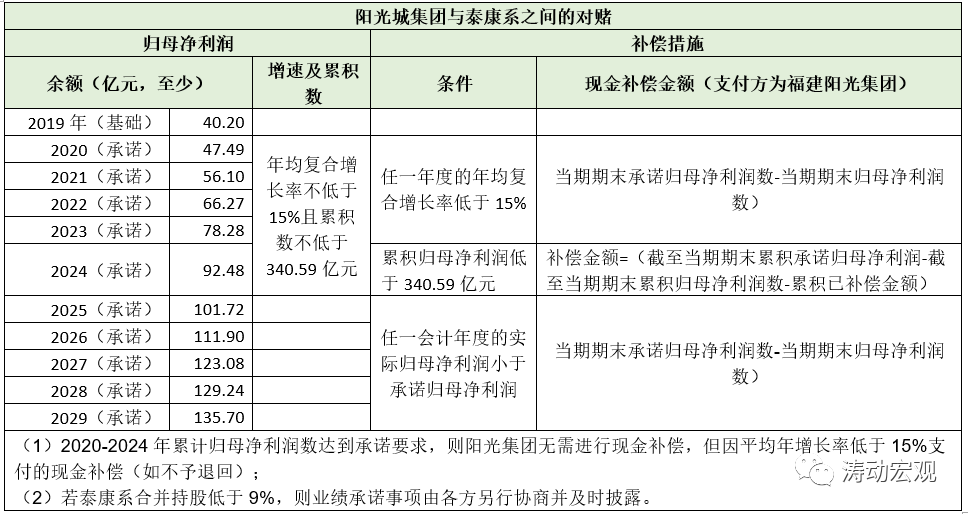 和派駐董事、現金分紅比率以及員工持股計劃等要求相比,最受關注的還是泰康系與福建陽光集團之間的十年業績對賭。