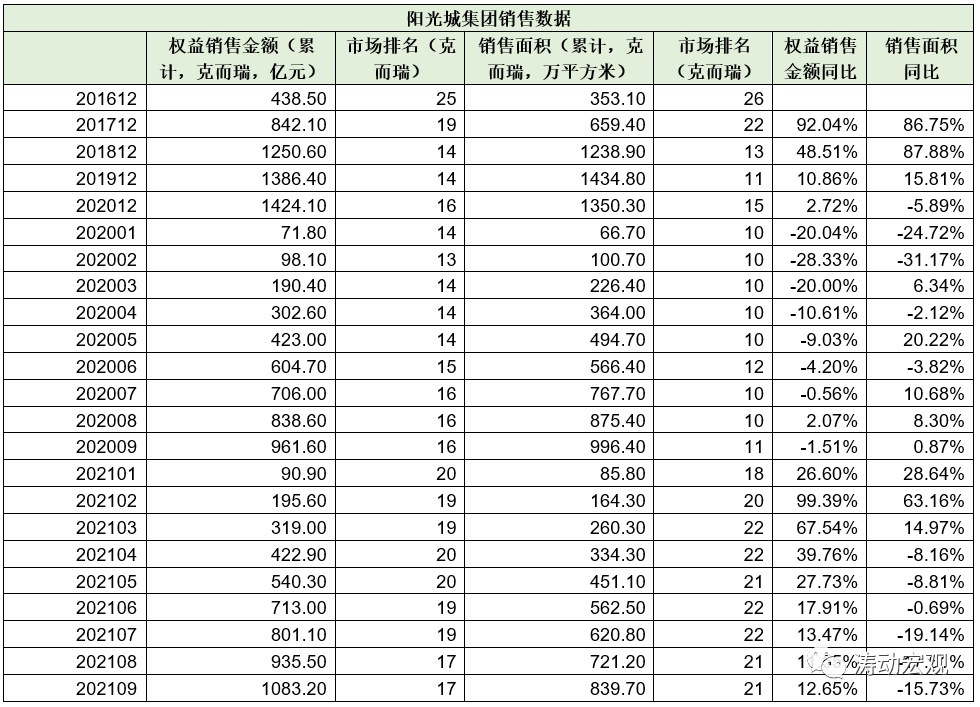 1、從銷售金額與銷售面積來看,陽光城集團目前在全國地產企業中排名20位左右。具體看,今年前9個月的權益銷售金額和銷售面積分別為1083.20億元(排名全國第17位)和839.70萬平方米(排名全國第21位)。