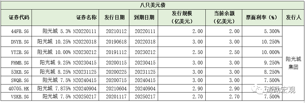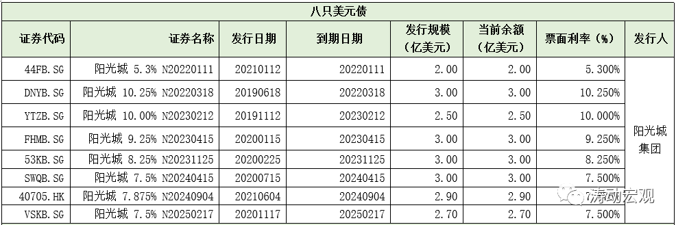 1、八只存量美元債(陽光城集團發行):余額合計22.10億美元