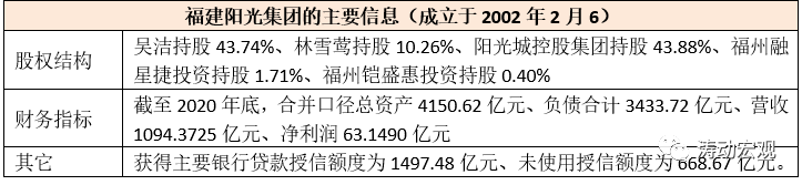 (1)陽光城體系的三大核心板塊分別為陽光城集團、福建陽光集團與陽光龍凈集團,主要從事著投資控股、地產開發、環保等業務,同時前兩大核心板塊也是陽光城體系的兩大發債主體。其中,截至2020年底,福建陽光集團的總資產規模達到4150.62億元、資產負債率達到82.73%,全年實現營收接近1100億元、凈利潤達到63.15億元,獲得主要銀行貸款授信額度接近1500億元。