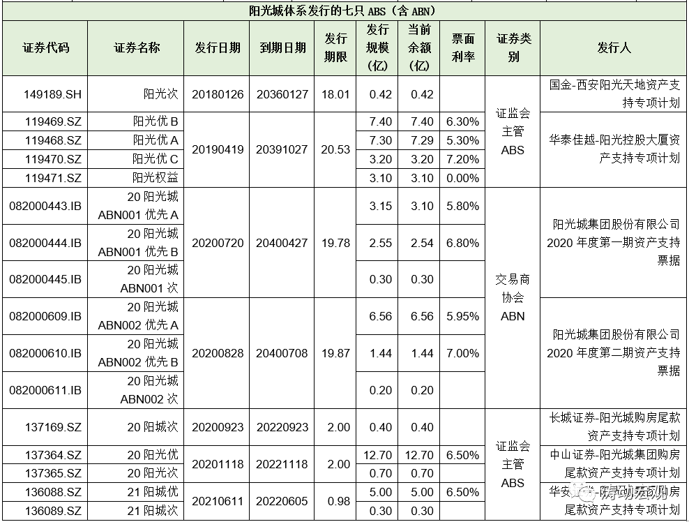 2、七只ABS(含ABN,陽光城集團發行):余額合計54.65億元人民幣