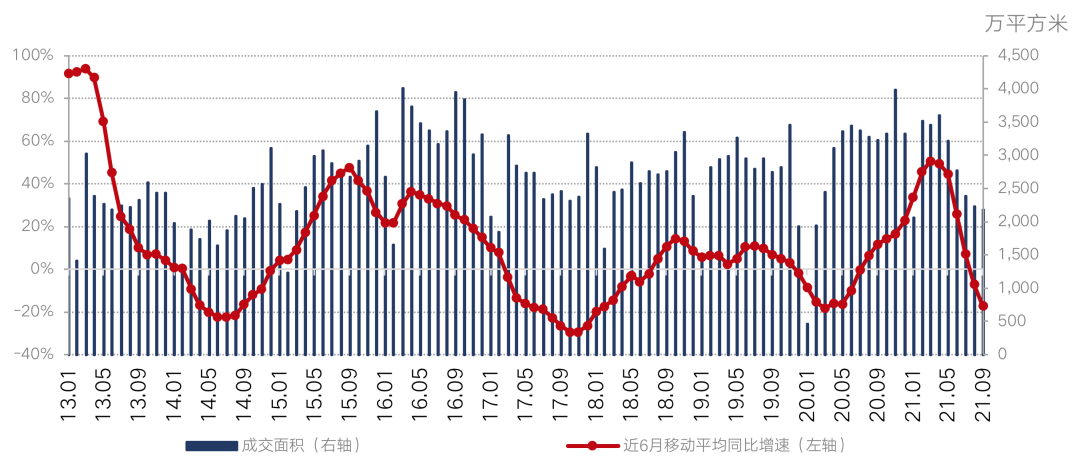 具體來看,2021年10月,易居研究院監(jiān)測的40個典型城市新建商品住宅成交面積環(huán)比下降1.9%,同比下降32.4%,創(chuàng)下2013年以來最差“銀十”,考慮到市場觀望情緒以及信貸政策尚未全面放松,預計接下來40城新建商品住宅成交量仍在探底,短時間內(nèi)或?qū)⒊掷m(xù)收縮。