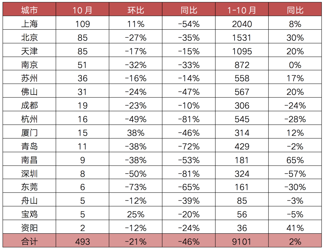 1-10月,16城累計成交9101萬平方米,同比漲幅進一步收窄至2%。其中,4成以上城市累計成交同比轉(zhuǎn)跌,深圳更以57%的累計同比跌幅居首。