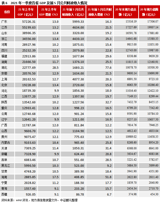從各省公布的上半年GDP來看,GDP均保持在9%以上的增長,主要與去年基數較低有關,也反映了國內經濟處于穩定恢復狀態。就地區來看,東部地區,GDP增速最高的為海南,同比增長均為17.5%,GDP增速最低的為河北,同比增長9.9%,廣東GDP為5.72萬億元,繼續居全國第一位;中部地區,GDP增速均在10%以上,增速最高的為湖北,同比增長28.5%,GDP增速最低的為河南,同比增長10.2%;西部地區,GDP增速最高的為重慶,同比增長12.8%,GDP增速最低的為青海和西藏,同比增長9.1%;東北地區,遼寧GDP同比增長9.9%,吉林和黑龍江分別同比增長10.7%、10.3%。