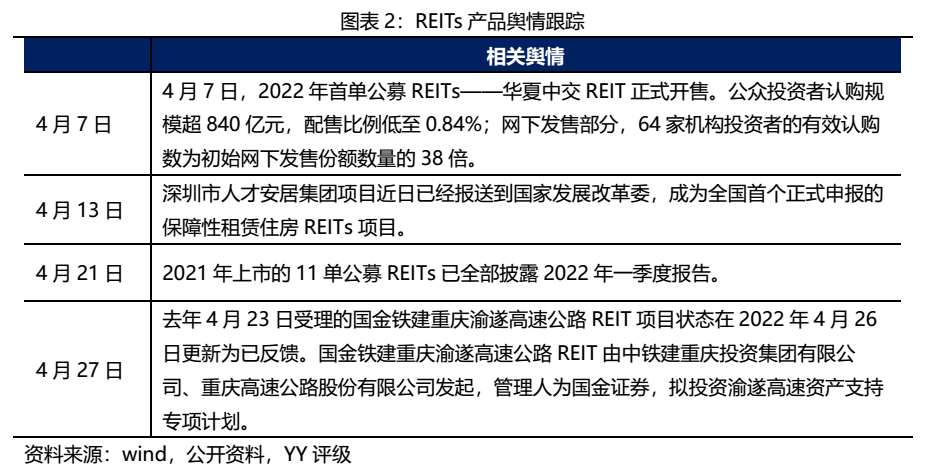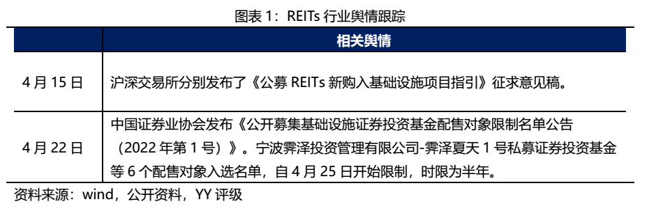 行業輿情跟蹤:滬深交易所發布《公募REITs新購入基礎設施項目指引》,REITs擴募再提速。時隔一年國金鐵建重慶渝遂高速公路REIT項目狀態更新為已反饋。另外,中證協將寧波霽澤投資管理有限公司和上海玖鵬資產管理中心兩家網下投資者6名配售對象納入公募REITs配售限制名單。