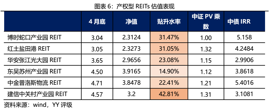 REITs為活躍的交易品種,因此其估值就是收盤價。目前產權型REITs市值均高于凈值,建信中關村產業園REIT升水率仍保持最高,為42.81%,最低為東吳蘇州工業園區產業園REIT,升水率為14.90%。截至2022年4月末,對比中證PV乘數,華安張江光大園REIT、建信中關村產業園REIT的市值與對應的ABS估值偏離較大,博時蛇口產業園REIT的市值與其ABS估值保持一致。從中債IRR來看,博時蛇口產業園、中金普洛斯REIT的IRR相對較高,在5%以上。