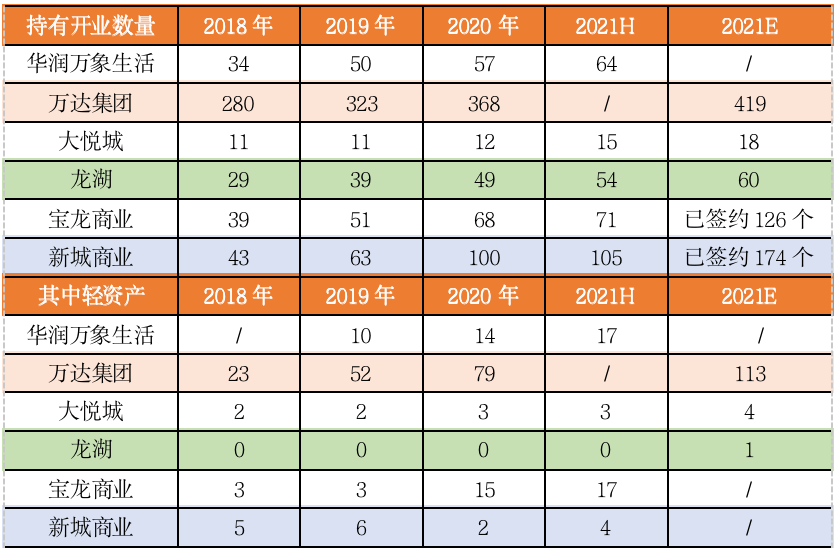 不過,當前部分房企仍以重資產戰略、合作為主,輕資產品牌輸出仍只是作為輔助手段進行運營。比如,龍湖當前已經開業60家天街項目,僅有一家是輕資產管理輸出,新城控股2021年中期開業項目達到105個,僅有4個項目是通過管理輸出實現。