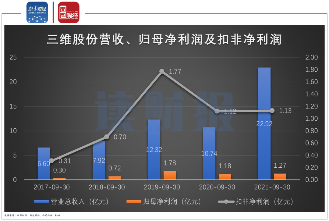 圖1:2017Q3-2021Q3三維股份營(yíng)收、歸母凈利潤(rùn)及扣非凈利潤(rùn)