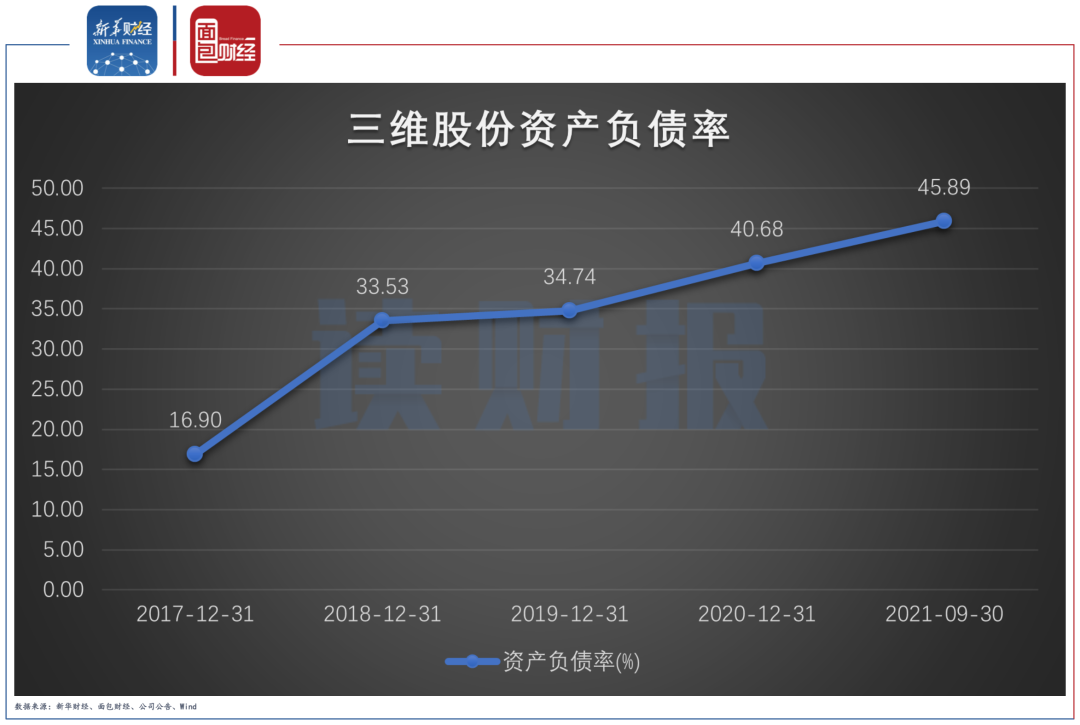 債務(wù)的增加也使得公司的資產(chǎn)負(fù)債率不斷上升。截至2021年9月末,三維股份的資產(chǎn)負(fù)債率為45.89%,較2020年末上升5.21個(gè)百分點(diǎn)。